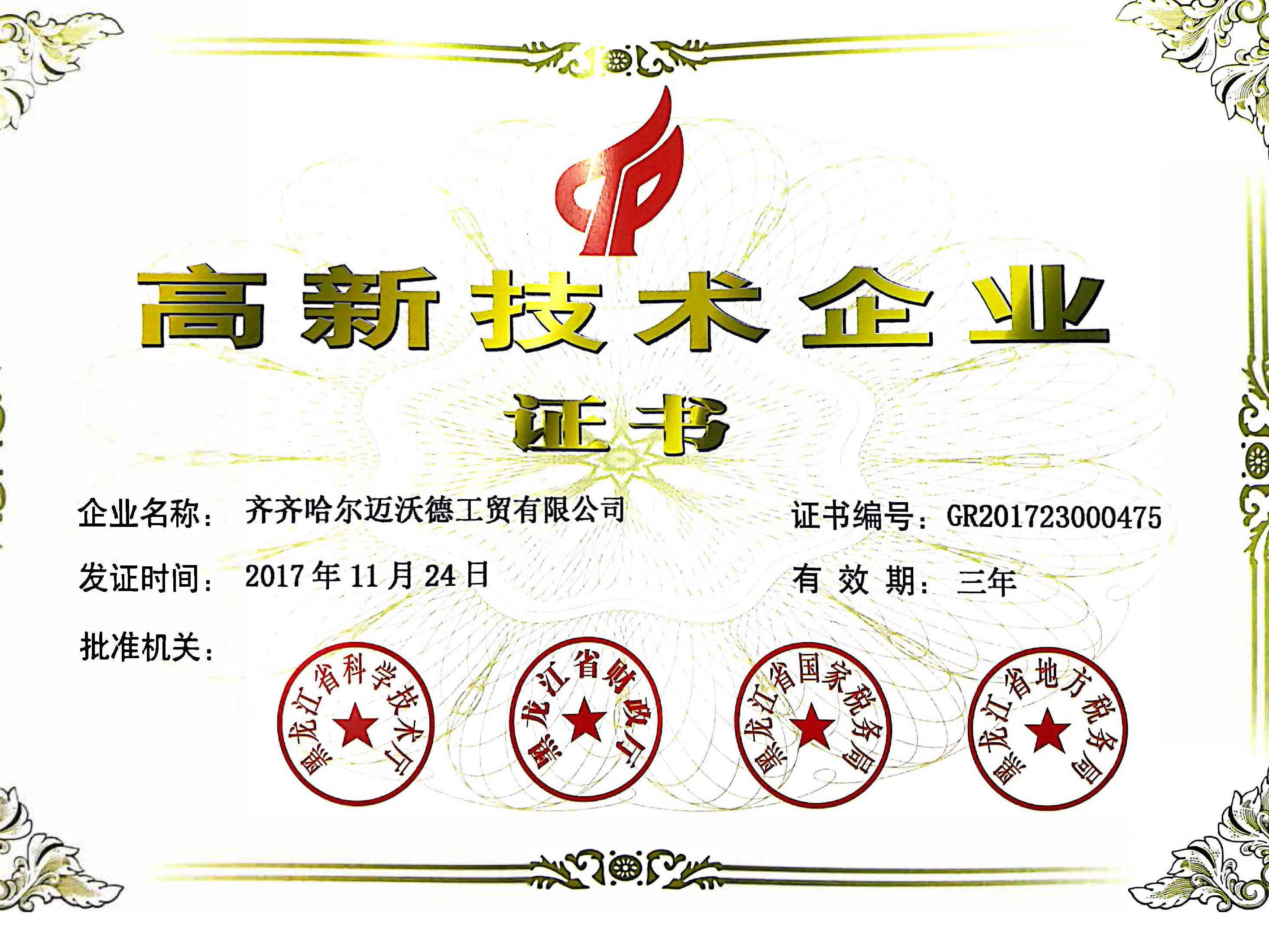 2017年 11 月 24 日,齊齊哈爾邁沃德工貿(mào)有限公司正式獲得“國家高新技術(shù)企業(yè)”證書,證書編號: RG201723000475, 該證書由黑龍江省科學(xué)技術(shù)......【點(diǎn)擊詳情】
